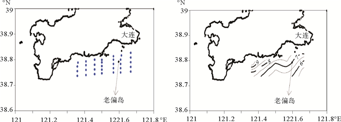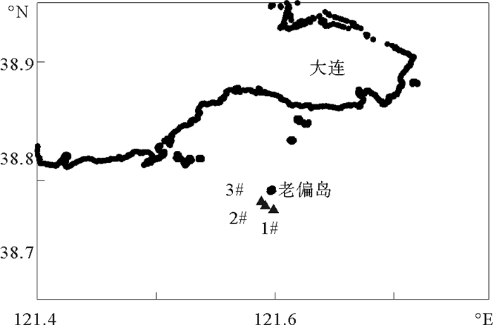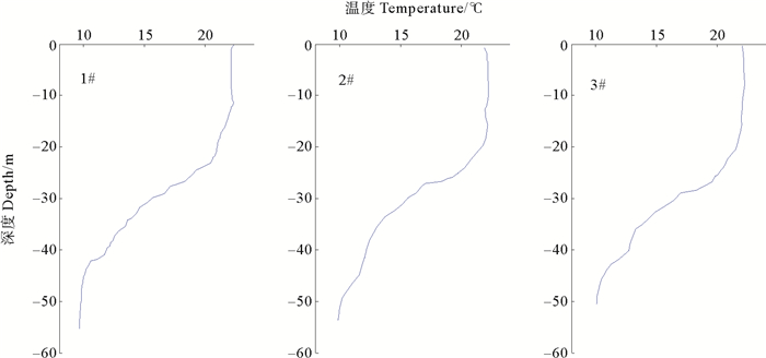 2.3.1 大连海域冷水垂向分布为验证冷水团的持续时间,2010年8月28日在大连老偏岛附近海域布设3个观测站进行水温观测,3个站点距陆地平均8 km左右,站点位置见图 7。3个站的水温垂直分布如图 8所示。