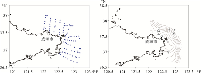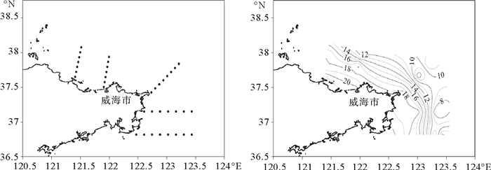 为了更深入地了解山东半岛的温度分布状况,对山东半岛海域进行了加密调查。在威海-成山头-荣成海域设置了12个断面91个观测站位,调查时间为8月上旬,观测站位及海域底层水温分布如图 6所示。