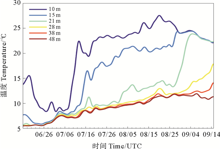 从图 9可知,10与15 m层的温度变化大且水温较高,21 m层在观测前期温度较低,于8月底剧烈升高至20 ℃以上,28和38 m层水温在9月初有明显上升趋势,底层(48 m)水温在整个观测时段变化较缓慢,从6月底的5 ℃缓慢升高至9月初的12℃左右,之后出现水温下降趋势。但应指出的是,在8月底之前,28 m以下的水温分布均匀且变化较小。