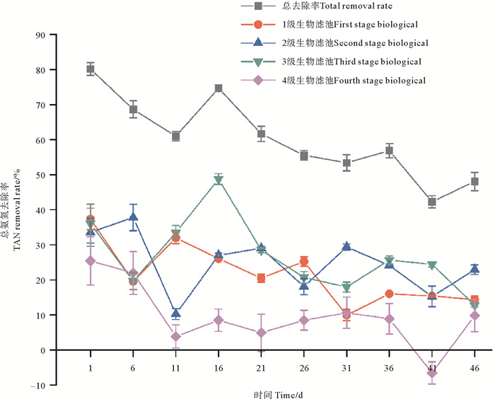 图 1 实验期间各级生物滤池TAN去除率 Fig. 1 TAN removal rates of various biofilters during the experiment |