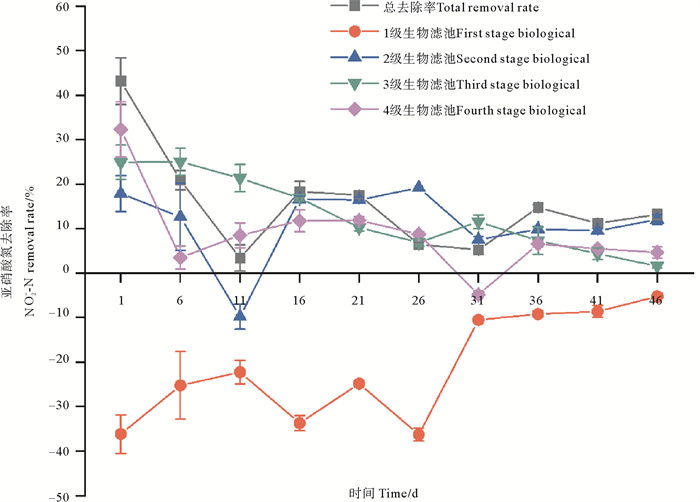 图 2 实验期间各级生物滤池NO2--N去除率变化 Fig. 2 NO2--N removal rates of various biofilters during the experiment |