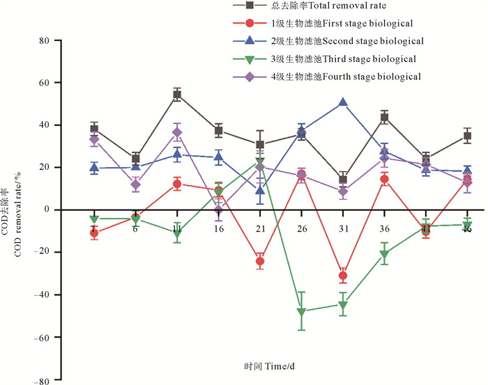 图 4 实验期间各级生物滤池COD去除率变化 Fig. 4 COD removal rates of various biofilters during the experiment |