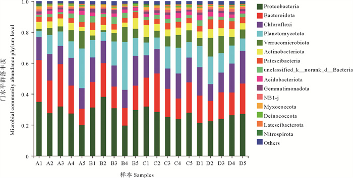 ( A~D分别表示1~4级生物滤池,1~5分别表示5个取样时间点。图示中unclassified_knorank_dBacteria表示数据库中没有类似序列的一个细菌门。A~D respectively represent 1~4 biological filters, and 1~5 respectively represent 5 sampling time points.In figure unclassified_knorank_dBacteria represents a phylum of bacteria with no similar sequence in the database. ) 图 5 生物滤池微生物在门水平的群落结构 Fig. 5 Community structure of microorganisms in biofilter at phylum level |