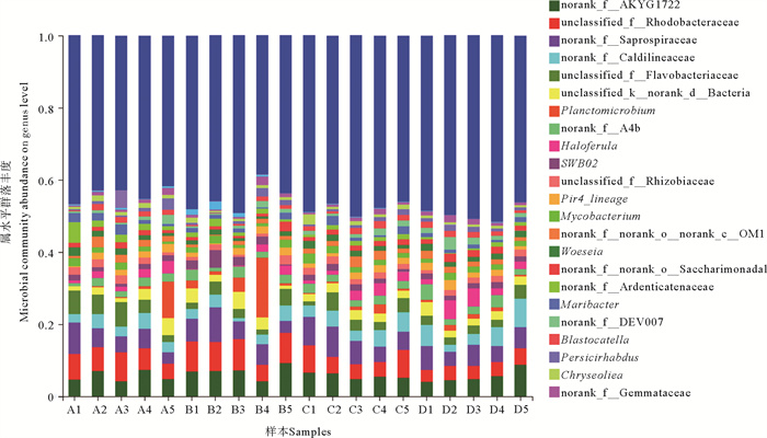 ( A~D分别表示1~4级生物滤池,1~5分别表示5个取样时间点。norank表示数据库中没有具体分类学信息;unclassified表示数据库中没有类似序列;f_表示科(Family),o_表示目(Order),c_表示纲(Class),k_表示界(Kingdom),d_表示域(Domain),例如f_Rhodobacteraceae表示红杆菌科。A~D respectively represent 1~4 biological filters, and 1~5 respectively represent 5 sampling time points. Norank indicates that there is no specific taxonomy information in the database; unclassified indicates that there is no similar sequence in the database; f_stands for Family, o_stands for Order, c_stands for Class, k_stands for Kingdomla, d_stands for Domain, for example, f_Rhodobacteraceae stands for Rhodobacteraceae. ) 图 6 生物滤池微生物在属水平的群落结构 Fig. 6 Community structure of microorganisms in biofilter at genus level |