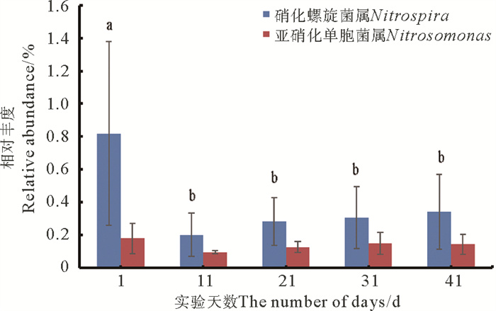 ( 图中字母不同表示二者之间存在显著性差异(P<0.05)。Different letters in the figure indicate significant differences between the two (P < 0.05). ) 图 7 硝化细菌属水平相对丰度变化 Fig. 7 Changes in relative abundance of Nitrifying bacteria at genus level |