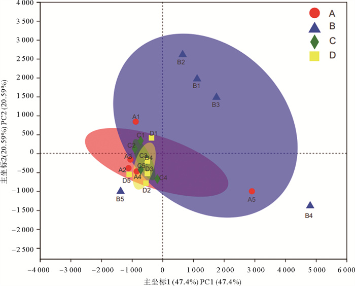 ( A~D分别表示1~4级生物滤池,1~5分别表示5个取样时间点。A~D respectively represent 1~4 biological filters, and 1~5 respectively represent 5 sampling time points. ) 图 8 生物滤池微生物群落OTU水平主成分分析 Fig. 8 Principal component analysis of microbial community in biofilter on OTU level |