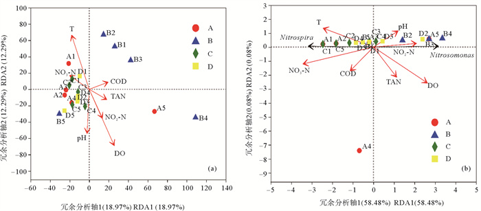 ( A~D分别表示1~4级生物滤池,1~5分别表示5个取样时间点;Nitrospia:硝化螺旋菌属;Nitrosomonas:亚硝化单胞菌属;T:温度;DO:溶解氧浓度;TAN:总氨氮浓度;NO2-N:亚硝酸氮浓度;NO3-N:硝酸氮浓度;COD:化学需氧量。A~D respectively represent 1~4 biological filters, and 1~5 respectively represent 5 sampling time points; Nitrospia: Nitrospia; Nitrosomonas: Nitrosomonas; T: Temperature; DO: Dissolved oxygen concentration; TAN: Total ammonia nitrogen concentration; NO2-N: Nitrite nitrogen concentration; NO3-N: Nitrate nitrogen concentration; COD: Chemical oxygen demand. ) 图 9 微生物群落OTU水平(a)、硝化细菌(b)与水环境因子的冗余分析 Fig. 9 Redundancy analysis of OTU level microbial community(a) and Nitrifying bacteria genera(b) and water environmental factors |