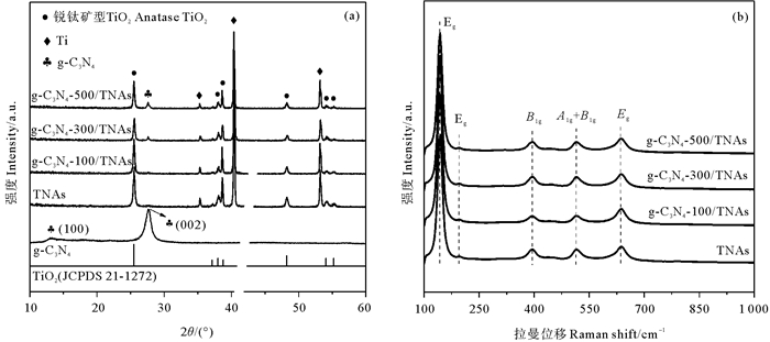 图 1 g-C3N4、TNAs和不同g-C3N4浓度下制备的g-C3N4/TNAs的XRD图(a);TNAs和不同g-C3N4浓度下制备的g-C3N4/TNAs的Raman光谱(b) Fig. 1 XRD patterns of g-C3N4, TNAs and g-C3N4/TNAs prepared at different g-C3N4 concentrations (a), and raman spectra of TNAs and g-C3N4/TNAs prepared at different g-C3N4 concentrations (b) |