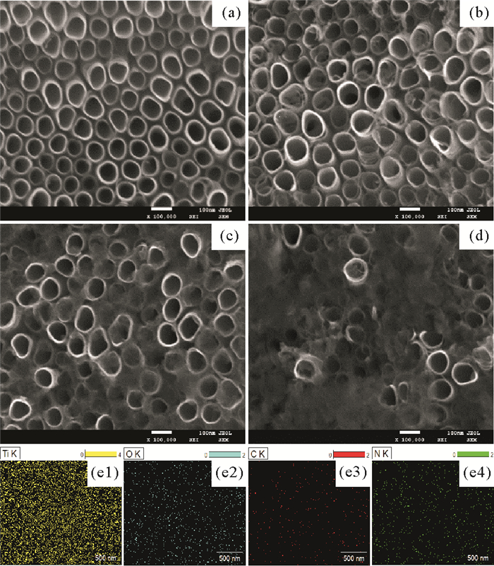 图 2 TNAs(a)、g-C3N4-100/TNAs(b)、g-C3N4-300/TNAs(c)和g-C3N4-500/TNAs(d)的SEM图;g-C3N4/TNAs-300的元素映射图及(e1 - e4)分别对应中Ti、O、C和N的映射图 Fig. 2 SEM images of TNAs (a), g-C3N4-100/TNAs (b), g-C3N4-300/TNAs (c) and g-C3N4-500/TNAs (d), elemental mapping of g-C3N4-300/TNAs, and (e1~e4) correspond to Ti, O, C and N maps, respectively |