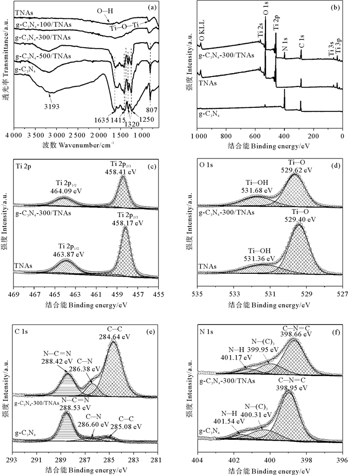 图 3 g-C3N4和不同g-C3N4浓度下制备的g-C3N4/TNAs的FT-IR光谱(a);g-C3N4、TNAs和g-C3N4-300/TNAs的XPS全谱图(b)及Ti 2p(c),O 1s(d),C 1s(e)和N 1s(f)的高分辨谱图 Fig. 3 FT-IR spectra of g-C3N4 and g-C3N4/TNAs prepared at different g-C3N4 concentrations (a), XPS survey spectra of g-C3N4, TNAs and g-C3N4-300/TNAs (b) and high-resolution spectra of Ti 2p (c), O 1s (d), C 1s (e) and N 1s (f) |