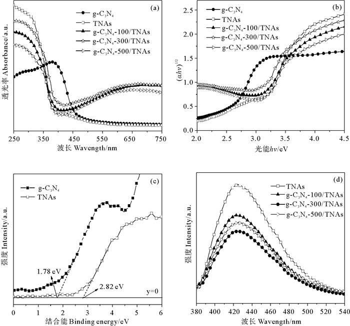 2.2 光电极的光电性能评价采用紫外可见漫反射技术和光致发光光谱评估了不同光电极的光吸收性能。由可见漫反射光谱图(见图 4(a))可知,TNAs只在波长小于400 nm的紫外光区域有较强的吸收,在400~450 nm之间有微弱的光响应,而在波长大于450 nm处的可见光区域内几乎不吸收。g-C3N4在小于550 nm的光区均有吸收,表明g-C3N4具有良好的可见光响应。与TNAs相比,g-C3N4/TNAs复合光电极的吸收边界发生了轻微的红移,在波长大于450 nm的可见光区吸收明显增强,说明g-C3N4的负载增强了光电极在可见光区的吸收,提高了可见光利用率。根据漫反射数据,光电极的带隙可以由Kubelka-Munk公式[24]计算得到,如图 4(b)所示。将所得曲线的线性部分延伸至(αhv)1/2 = 0处可以获得TNAs和g-C3N4的带隙分别为2.61和3.13 eV,这与以往的报道类似[25]。g-C3N4-100/TNAs、g-C3N4-300/TNAs和g-C3N4-500/TNAs的带隙分别为3.02、2.94和3.03 eV,均比TNAs的带隙低,说明窄禁带半导体g-C3N4的负载可以缩小TNAs的带隙,拓宽光吸收范围。由图 4(c)可知,由XPS价带谱得到的TNAs和g-C3N4的价带电势分别是2.82和1.78 eV。根据带隙和价带电势计算出TNAs和g-C3N4的导带电势分别是-0.31和-0.83 eV,两者的能级结构促进了光生电子和空穴的迁移,抑制了光生载流子的复合。通过光致发光光谱进一步确定光生载流子的复合情况,光电极的光致发光强度越低,其光生载流子的复合率越低,越有利于光电催化反应[26]。由图 4(d)可知,TNAs和g-C3N4/TNAs均在425 nm附近有最大的吸收峰,且所有g-C3N4/TNAs光致发光强度均比TNAs低,说明g-C3N4的负载抑制了光生载流子的复合。其中g-C3N4-300/TNAs具有最低的光致发光强度,表明当浸渍液g-C3N4浓度为300 mg·L-1时制备的光电极具有较低的光生载流子复合效率。