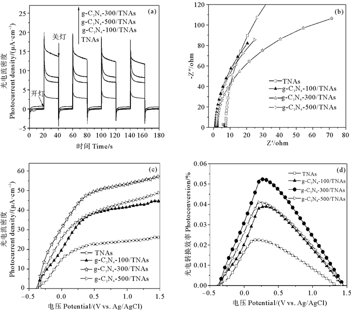 所有光电极的线性扫描伏安曲线如图 5(c)所示,相同电压下,TNAs产生的光电流密度最小,可能是TNAs较宽的带隙、较低的光吸收范围和较大的光生载流子复合效率所导致[30]。在所有g-C3N4/TNAs中,g-C3N4-300/TNAs的光电流密度最高,说明适量g-C3N4的负载会促进光生载流子的生成和分离。由图 5(d)可知,g-C3N4-300/TNAs在0.268 V vs. Ag/AgCl电压下的光电转化效率最高,达到0.053%,是相同电压下TNAs(0.022%)的2.4倍,说明负载适量的g-C3N4可以有效地提高TNAs的光电转换效率。根据光电化学性能分析结果可知,g-C3N4的负载可以促进TNAs光电极光生载流子的生成,提高光生载流子分离效率及光电转换效率。