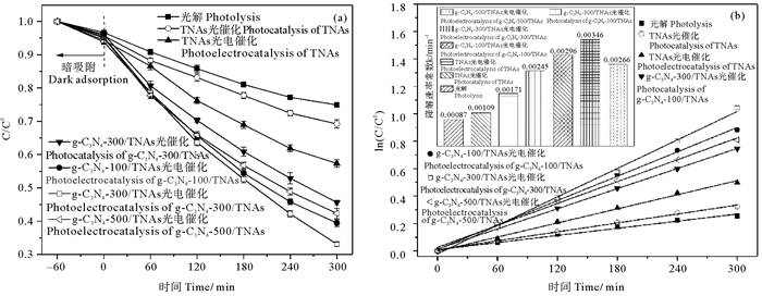 2.3 不同光电极光电催化降解m-CNB的性能由图 6(a)可知,在1 h的暗处理阶段,所有光电极对m-CNB有少量的吸附。经单独可见光照射下,反应300 min后,m-CNB的纯光解效率为(25.06±0.70)%,表明m-CNB稳定的化学结构不利于其光分解。TNAs在可见光照射下反应300 min对m-CNB的降解效率仅为(30.08±1.24)%,主要是TNAs较差的可见光响应降低了其可见光催化降解m-CNB的性能,这与漫反射结果相一致。g-C3N4-300/TNAs在可见光照射300 min后,对m-CNB的降解效率为(54.38±0.69)%,说明g-C3N4的负载可以提高TNAs对可见光的吸收,从而提高对m-CNB的光催化降解效率。在施加1.5 V外加偏压后,TNAs对m-CNB的光电催化降解效率增加到(42.68±1.12)%,表明外加偏压可以提高光催化体系对m-CNB的降解效率。相较于TNAs光电极,所有g-C3N4/TNAs对m-CNB的光电催化降解效率均有所增加。其中g-C3N4-100/TNAs、g-C3N4-300/TNAs和g-C3N4-500/TNAs对m-CNB的光电催化降解效率分别为(60.57±1.04)%、(66.92±0.66)%和(57.68±1.51)%。由图 6(b)可知,不同体系下m-CNB的降解均符合一级动力学过程,其中,g-C3N4-300/TNAs对m-CNB的光电催化降解具有最大的反应速率常数(0.003 46 min-1),分别为TNAs光电催化降解(0.001 71 min-1)和g-C3N4-300/TNAs光催化降解(0.002 45 min-1)的2.0和1.4倍。g-C3N4/TNAs对m-CNB的光电催化降解效率和反应速率常数随浸渍液g-C3N4浓度的增加呈现先升高后降低的趋势,说明TNAs表面负载适量的g-C3N4有助于提高其对m-CNB的光电催化降解效率和反应速率常数,而过量的g-C3N4可能会成为光电极光生载流子的复合中心,从而降低了对m-CNB的光电催化降解性能[31]。
