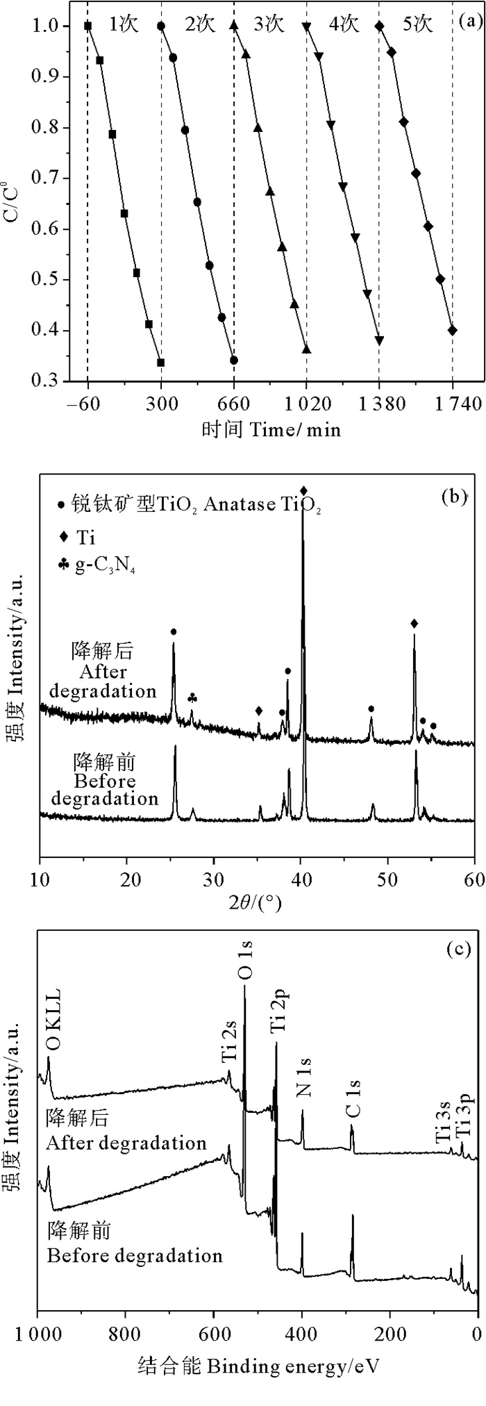 图 7 g-C3N4-300/TNAs对m-CNB光电催化降解的可重复性(a);光电催化降解前后g-C3N4-300/TNAs的XRD图(b)和XPS全谱图(c) Fig. 7 Reusability of g-C3N4-300/TNAs for photoelectrocatalytic degradation of m-CNB (a), XRD (b) and XPS survey spectra (c) of g-C3N4-300/TNAs before and after photoelectrocatalytic degradation |