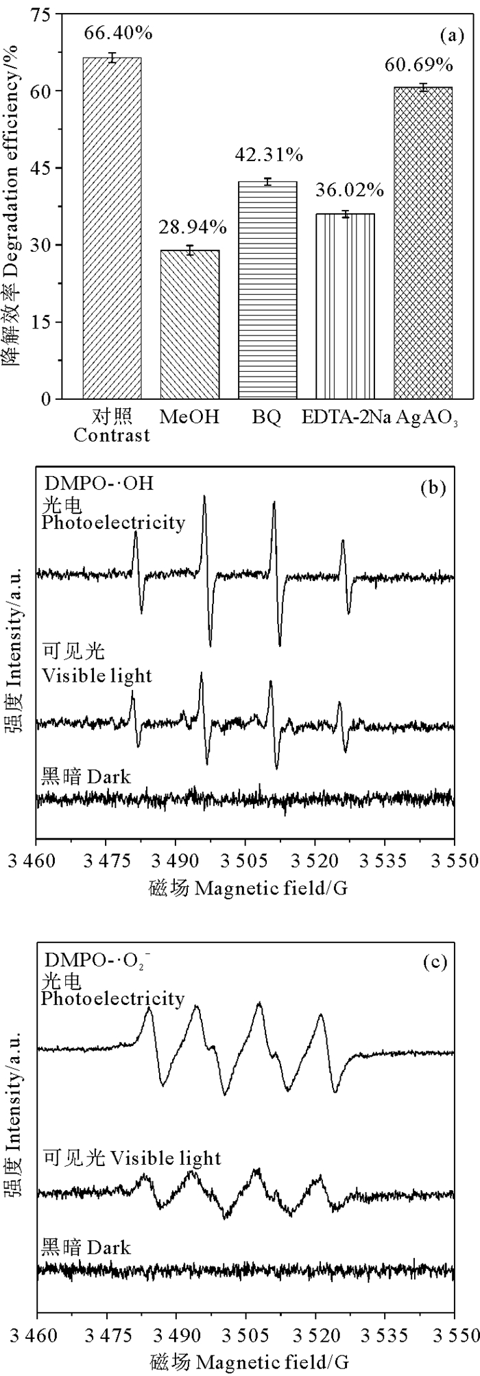 图 8 不同捕获剂对g-C3N4-300/TNAs光电催化降解m-CNB效率的影响(a);g-C3N4-300/TNAs在不同条件下生成·OH(b)和·O2-(c)加合物的EPR光谱 Fig. 8 Effects of different scavengers on the photoelectrocatalytic degradation efficiency of m-CNB (a), EPR spectra of ·OH (b) and ·O2- (c) adducts produced by g-C3N4-300/TNAs under different conditions |