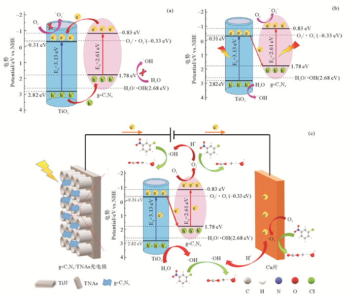 基于(αhv)1/2-hv关系曲线图和XPS价带谱(见图 4)计算的TiO2和g-C3N4的带隙和导带、价带电势,可知TiO2的导带和价带电势均低于g-C3N4,推测在g-C3N4-300/TNAs中TiO2和g-C3N4之间存在II型或Z型异质结两种电荷转移机制。由图 9(a)可知,假设TiO2和g-C3N4为II型电荷转移机制,光生电子可从g-C3N4的导带转移至TiO2的导带,光生空穴可从TiO2的价带转移至g-C3N4的价带。由于TiO2的导带电势(-0.31 eV)高于O2/·O2-(-0.33 eV)[34],g-C3N4的价带电势(1.78 eV)低于H2O/·OH(2.68 eV)[35],导致TiO2导带上的光生电子和g-C3N4价带上的光生空穴无法将O2和H2O转化成·O2-和·OH。活性物质捕获实验和EPR光谱证实了g-C3N4-300/TNAs在光电催化体系能够生成·O2-和·OH,因此,在g-C3N4-300/TNAs中TiO2和g-C3N4之间为II型电荷转移机制的假设不成立。如图 9(b)所示,当TiO2和g-C3N4之间为Z型电荷转移机制时,光生电子从TiO2的导带向g-C3N4的价带迁移,与g-C3N4价带位置上的光生空穴复合,这一过程抑制了TiO2和g-C3N4光生载流子的重组。光生电子和空穴分别在g-C3N4的导带和TiO2的价带积聚,由于g-C3N4的导带电势(-0.83 eV)比O2/·O2-的还原电位(-0.33 eV)更负,光生电子可以还原O2产生·O2-。TiO2的价带电势(2.82 eV)高于H2O/·OH的氧化电位(2.68 eV),光生空穴可以氧化H2O产生·OH,这与活性物质捕获实验和EPR光谱结论一致。因此,在g-C3N4-300/TNAs中TiO2和g-C3N4之间形成的异质结符合Z型电荷转移机制。最终提出g-C3N4-300/TNAs光电催化降解m-CNB的可能机理图,如图 9(c)所示。在光电催化过程中生成的·OH可以直接氧化降解m-CNB,而生成的·O2-既可以氧化降解m-CNB还可以与溶液中的H+反应生成·OH。在外加偏压作用下,一部分光生电子会经外电路转移至阴极的铜片上,在阴极表面将O2还原为·O2-,这个过程进一步促进了光生载流子的分离,有利于g-C3N4-300/TNAs光电催化性能的提高。