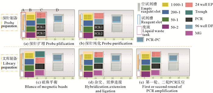① 杂交液放置在100 mL试剂槽site2 (图 1(d)标记为试剂槽),制备好探针放置于4位微板载架的site2位(标记为Trough),上一步平衡好的磁珠放置在site3板位(图 1(d)标记为PCR),样品DNA保存于96孔PCR板中,放置在4位微板载架的site4位(图 1(d)标记为MG)。