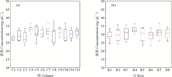 ((a)12列之间的浓度分布箱型图; (b) 8行之间的浓度分布箱型图。(a) Boxplot of mean product concentration per column; (b) Boxplot of product concentration per row. ) 图 4 探针纯化后列之间和行之间的浓度箱型图 Fig. 4 Box diagrams between columns and rows after purification |