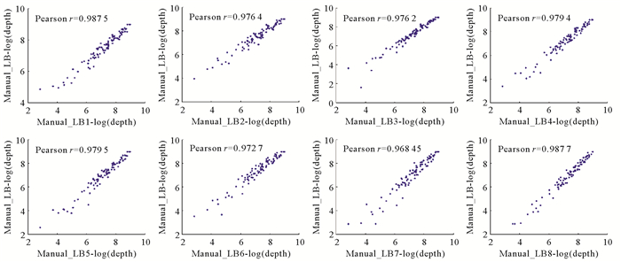 (Manual_LB-log(depth):人工制备文库测序深度的log值; LB1-LB8:8个自动化制备的文库。Manual_LB-log(depth): Log value of sequencing depth of manual library; LB1-LB8:8 automated libraries. ) 图 5 自动化制备的文库与人工建库相比测序深度的一致性 Fig. 5 The correlation of sequencing depth between automated library and manual library |