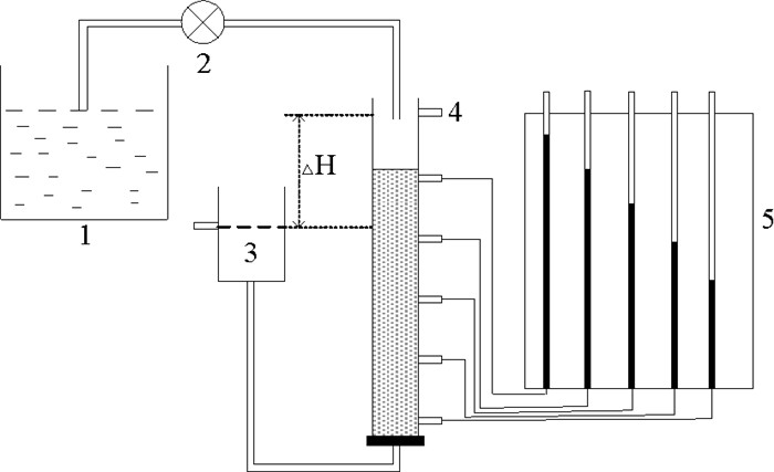 ( 1.黏土胶体悬浮液;2.蠕动泵;3.定水头装置;4.溢流口;5.测压板。1.Clay particle suspension; 2.Peristaltic pump; 3.Fixed head device; 4.Overflow port; 5.Pressure measuring tube. ) 图 1 实验装置图 Fig. 1 Experimental device diagram |