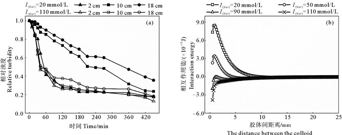 2 结果与讨论 2.1 高岭土胶体静水絮凝不同离子强度(20、50、90和110 mmol/L)条件下高岭土黏土胶体静水絮凝过程中溶液浊度(溶液深度2、10和18 cm)随时间变化曲线以及高岭土胶体间相互作用能曲线见图 2。图 2(a)显示,离子强度对高岭土黏土胶体絮凝有明显影响。NaCl溶液的离子强度愈低,黏土胶体的絮凝过程愈慢。当钠离子强度为20 mmol/L时,在15 min时高岭土胶体溶液出现分层,其中分层现象在90 min时最为明显,液面下2、10和18 cm处溶液浊度分别为0.35、0.79和0.87。随着时间的延长,溶液分层现象逐渐减弱,直至420 min时,溶液不同深度处浊度仍没有达到完全一致,说明在此条件下,高岭土胶体的絮凝过程较缓慢。通过计算发现,此时高岭土胶体间总相互作用能大于0,说明胶体间静电斥力占优势,且斥力能障最大,达到了8.48×10-18 J,即胶体间不容易发生絮凝;而当Na+离子强度增加至110 mmol/L时,黏土胶体溶液不同深处的浊度在很短时间内就已基本一致,几乎没有出现分层现象,此时高岭土胶体间的总相互作用能小于0,即范德华引力占优势且无法形成斥力能障,此时胶体间容易发生絮凝而快速聚沉。李学凯[13]探究硫酸钾对泥沙絮凝过程影响时也存在相似的现象。当硫酸钾浓度较低时,随着时间的增加,泥沙量在空间上分布呈现随着沉降距离的增加而增加的规律,说明泥沙在絮凝过程中同样会出现分层现象;而电解质浓度的增加,对泥沙颗粒间絮凝产生更强的促进作用,分层现象随之逐渐减弱,不同深度处的泥沙量分布较均匀。