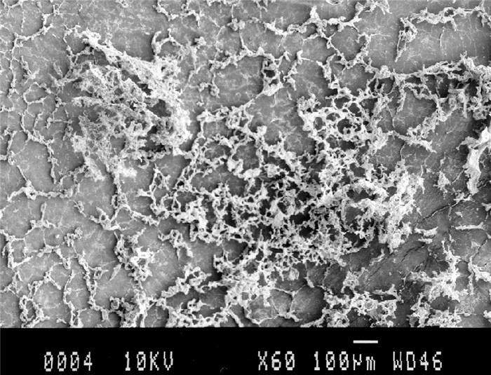 由图 2可见,不同深度处高岭土胶体溶液的相对浊度随时间的变化存在不一样的函数关系,上层溶液(液面下2 cm处)的相对浊度符合对数函数y=-Alnx+B形式,中部(液面下10 cm处)和底部(液面下18 cm处)溶液的相对浊度随时间变化曲线符合指数函数y=Ce-Dx,原因是胶体溶液上层发生的是单颗粒间的团聚絮凝,中下层出现的是网状的絮团团聚[14]。下层高岭土悬浊液干燥后的扫描电子显微镜照片证实了上述结论(见图 3),其中,参数D越大,溶液相对浊度随时间的变化率越大。