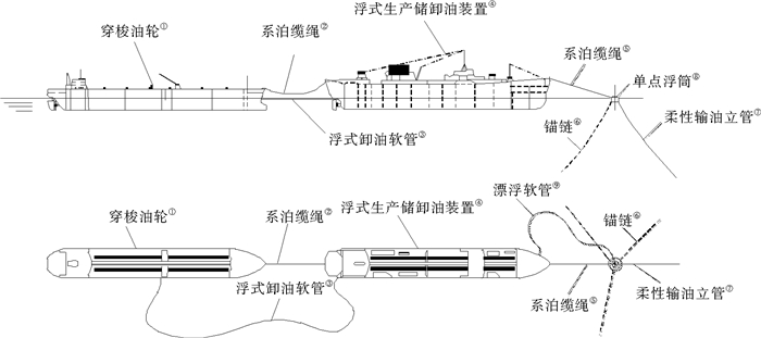 ( (①Shuttle tanker; ②Hawser; ③Hose; ④FPSO; ⑤Hawser; ⑥Anchor chain; ⑦Flexible riser; ⑧Siogle point buoy; ⑨Floating hose.) ) 图 1 串靠外输系统 Fig. 1 Tandem offloading system |