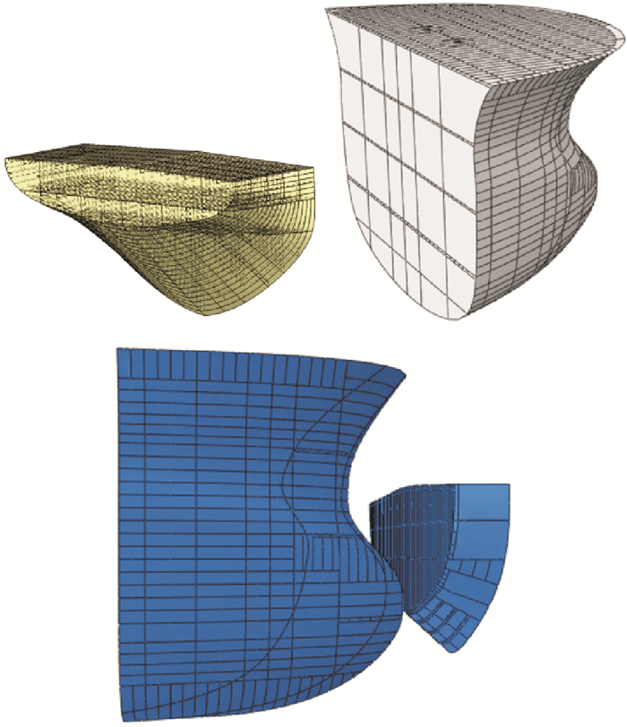2.1 碰撞模型建立及模型简化本文采用CATIA软件和ABAQUS分别建立FPSO尾部结构与穿梭油轮首部结构的碰撞模型。被撞船选取FPSO从尾封板开始FR0~FR4范围内的尾部结构作为分析对象,撞击船选取穿梭油轮防撞舱壁之前的首部结构作为分析对象。图 3为FPSO尾部结构和穿梭油轮首部结构的几何模型。然后将CATIA软件建立的尾部模型导入ABAQUS软件中,之后的分析过程都将在ABAQUS软件中进行。