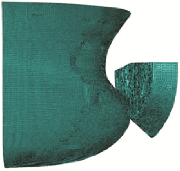 由于在研究出现两艘碰撞船舶的同步损伤情况,故本模型在进行有限元划分时,将被撞船尾部和撞击船首部均划分为大小200 mm的细网格(见图 4)。
