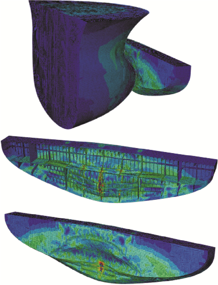 由于被撞船(FPSO)处于满载状态,撞击船(穿梭油轮)处于压载状态,因此两者的吃水存在较大差距。碰撞区域集中在被撞船尾部结构的中下方,只有撞击船的球鼻首结构接触到被撞船尾部,撞击船的首柱部分并未参与碰撞过程。从图 5中也可以看出,撞击船首部结构除了与被撞船尾部直接碰撞的区域发生了较大的屈曲、压溃变形外,其他部位的损伤变形程度较小。