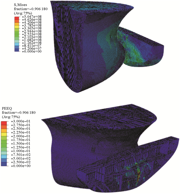 3.2 应力与应变分析FPSO尾封板处的单元发生失效后,FPSO尾部内部构件均在很短时间内迅速超过普通钢的最小屈服极限235 MPa进入塑性流动状态,单元失效发生在t=2.1 s时,即塑性应变值达到最大塑性失效应变值0.3时,失效位置主要集中在碰撞接触区域。碰撞过程中最大等效应力为504.7 MPa,大约是静态屈服极限的2.15倍。尾部远离球鼻首撞击的位置则主要发生弹性变形而未发生破裂失效(见图 6)。