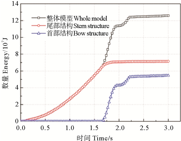 被撞船的尾部结构在碰撞开始阶段吸收的能量迅速增加,在碰撞后期吸能的增长速度变得平缓,这是由于碰撞初期结构发生了较大的局部屈曲变形,直至尾部构件破裂后,尾部结构的抵抗能力迅速下降,吸能能力逐渐减弱。船首结构在碰撞的开始阶段吸收的能量很小,可以忽略,但是随着尾部结构的破裂失效,船首结构的吸能速率迅速上升,此时首部构件发生了局部的塑性变形,随着碰撞地进一步加深,首部结构的变形趋势逐渐变缓,吸能速率也随之趋缓。