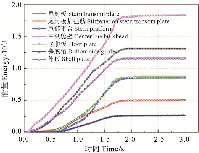 3.5 FPSO尾部各构件吸能情况碰撞过程中FPSO尾部各构件吸能时程曲线如图 9所示,碰撞结束时刻FPSO尾部各构件的吸能情况如表 1所示。