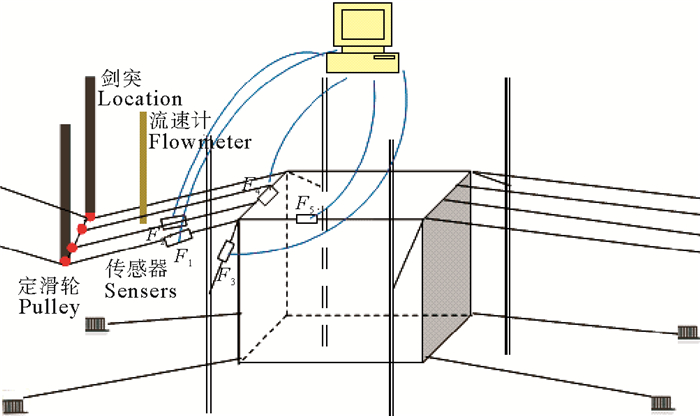 试验设备及模型的安装如图 1。围网模型由柔性的框架、网衣、以及系泊绳索、贴底沉链等组成。水下共装配5个传感器,分别安装在2条框架纲和3条系泊缆绳上。试验时,传感器将信号值传输到计算机。