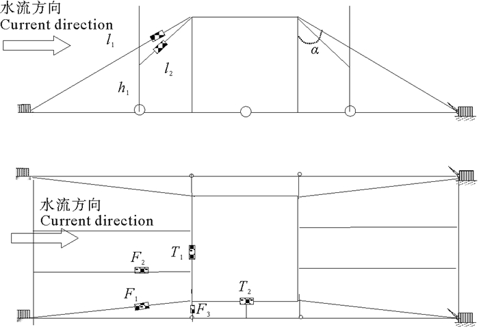 2.3 测试点的选择为了对围网模型框架系统的水动力变化规律进行记录与分析,在框架纲和系泊缆绳上共选择了5个测量点(见图 2),并分别在3条系泊缆绳和2条框架纲上安装水下张力传感器(日本电子工业株式会社制造,型号分别为A3604-1和A3604-2,量程均为10 kg,测量误差±1%FS)。为方便记录,标记顺流方向右边系泊缆绳张力为F1、顺流方向第二条系泊缆绳张力为F2,垂直方向右边侧向系泊缆绳张力为F3,垂直水流方向框架纲张力为T1,顺流方向右边框架纲张力为T2,其中,水流方向4条系泊缆绳等距离系泊敷设,相邻两纲间距为0.5 m。通过系泊距离和水深关系计算系泊缆绳与垂直方向的夹角α。