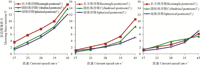 长方体浮筒、圆柱体浮筒和球体浮筒在系泊角度α = 71°、不同流速的情况下,系泊缆绳张力的变化情况见图 3。实验结果表明,随着流速的不断增大,3种类型浮筒的系泊缆绳张力均不断增大。当流速V≤35 cm/s时,系泊缆绳的张力变化均比较平稳。当V>35 cm/s时,3条系泊缆绳的张力急剧增大,其中F1、F2增幅最为明显,特别是圆柱体浮筒的F2从V=35 cm/s时的3.88 N增大到V=45 cm/s时的8.39 N,增幅高达116.24%。系泊缆绳这种变幅从纲索的布局结构来看,其张力主要分布在平行于水流方向的2条纲索上,平行于水流方向的2条系泊缆绳张力中,长方体浮筒明显大于圆柱体浮筒和浮球浮筒,而与水流相垂直的系泊缆绳F3较小,且随流速的增加变化也较小,说明张力的大小与缆绳的装配有关。
