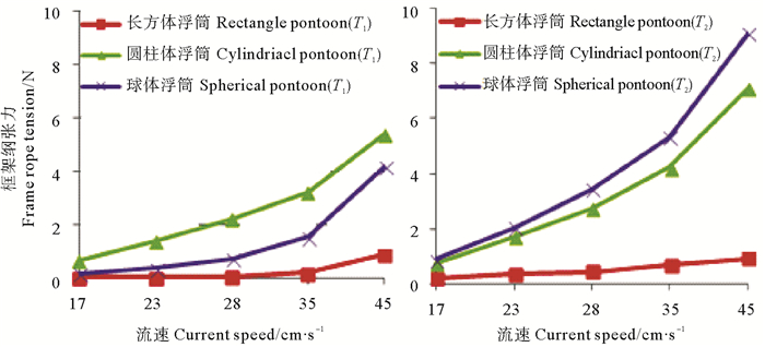 图 4 框架纲张力随流速的变化 Fig. 4 The change of tension of the frame ropes under different current speeds |