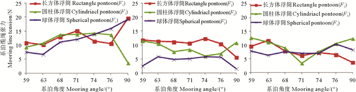 对于系泊缆绳F3,长方体浮筒的张力基本随系泊角度的增大而逐渐减小; 圆柱体浮筒的F3在系泊角度的变化过程中先减小后增大,当α = 71°时达到最小。球体浮筒除了在系泊角度为76°时出现最大值外,在其他系泊角度下均处于一个稳定的变化趋势。其原因为张力F3与水流方向垂直,随系泊角度的增大,长方体浮筒在垂直于来流方向产生的横向剪切力减小,因此张力F3逐渐减小。由于球体浮筒的对称性,在来流作用下不产生横向剪切力或剪切力微弱,因此张力F3变化较小。