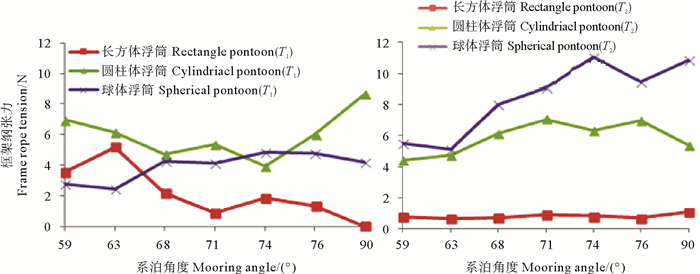 图 6 框架纲张力随系泊角度的变化 Fig. 6 The change of tension of the frame ropes under different mooring angles |