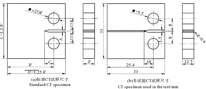 图 1 标准CT试样与本试验CT试样尺寸图 Fig. 1 Different size of the standard CT specimen and the CT specimen used in the test |