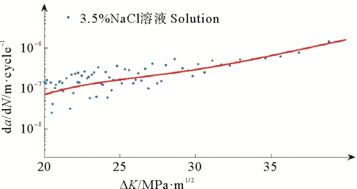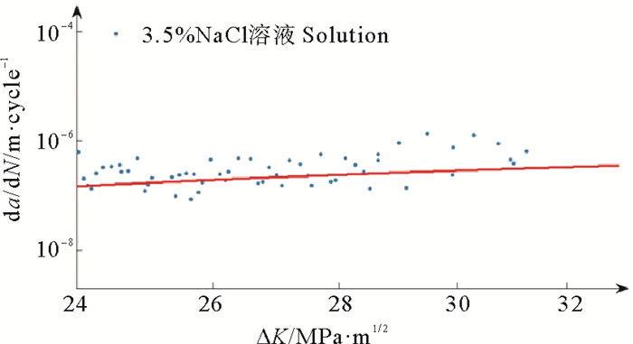 图 9 3.5%NaCl体系下试样2的da/dN与ΔK示意图 Fig. 9 da/dN and ΔK of specimen 2 in 3.5%NaCl system |