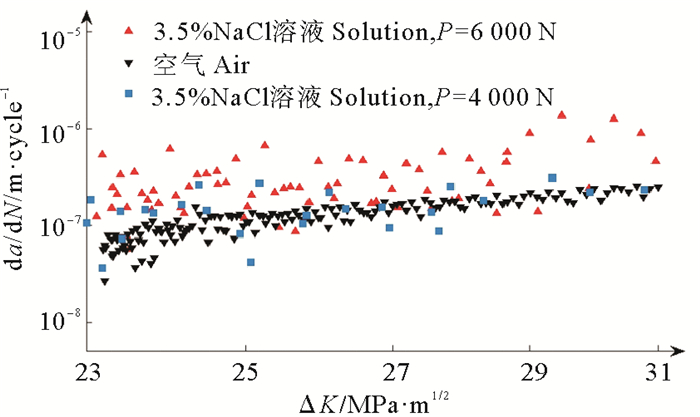 (2) 增长相同的裂纹长度,在3.5%NaCl溶液环境下比空气环境下所需加载周数低8 320次;同时3.5%NaCl溶液环境比空气体系下的裂纹扩展阈值低25%。因此和惰性环境(空气)相比,腐蚀环境的存在可明显的加快腐蚀疲劳裂纹的扩展速率以及降低裂纹扩展的阈值。