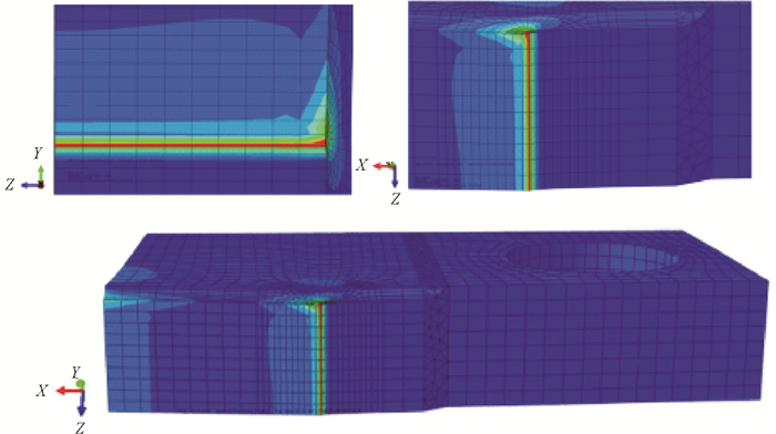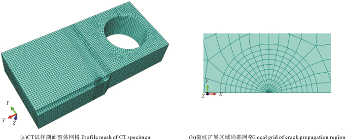1.2.1 基于ABAQUS的三维CT试样几何模型建模利用ABAQUS软件按图 1(b)的尺寸进行建模。在有限元建模过程中,CT试样的几何特征、载荷施加和边界约束条件都具有一定的对称性,故采取模型的1/4进行分析。网格划分过程中,选择C3D20R网格单元,设置合适的网格密度,如图 2(a)所示。本文将构件剖分,对裂纹扩展区进行足够的剖分,以便保证构件各部分采用较合理的网格划分方式,如图 2(b)所示。