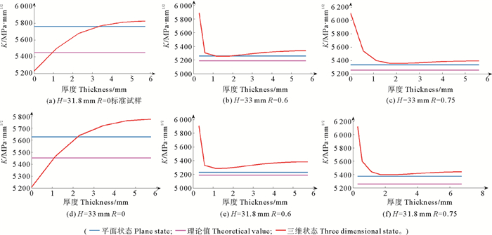 图 4 平面、三维和理论状态下不同尺寸CT试样的应力强度因子 Fig. 4 SIFs under plane, three-dimension and theoretical states of CT specimens of different sizes |