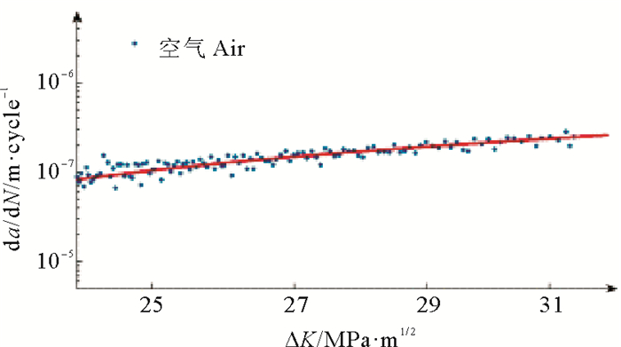 2.2 试验结果分析 2.2.1 空气环境下定载扩展规律分析对第一组试样在双对数坐标系下,建立空气环境下疲劳裂纹扩展速率da/dN与应力强度因子ΔK的关系,如图 8所示。在定幅荷载作用下,空气环境下裂纹扩展的稳定阶段da/dN与ΔK呈线性关系,即可以采用Paris公式进行拟合,拟合结果为: