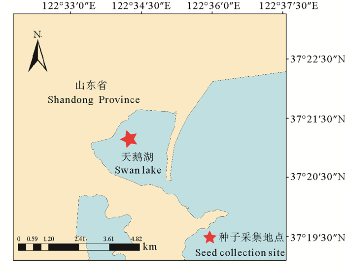 1 材料与方法 1.1 实验材料实验用鳗草种子于2019年7月采集于山东省荣成市天鹅湖海域(37°20′18″N —37°21′32″N, 122°33′18″E—122°34′45″E,见图 1)。在鳗草分布较多的区域采集生殖枝,将佛焰苞摘下后放入网目孔径为1.0 mm的尼龙网袋中,置于自然海域1个月。待种子成熟脱落后,移入处理箱中加入海水搅拌,除去上层有机碎屑及贝壳等杂质,收集至广口瓶中带回实验室,于4 ℃、盐度30的海水中保存。为减少真菌的生成,保存期间每两天换水一次。