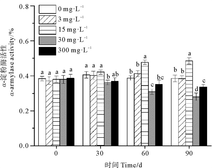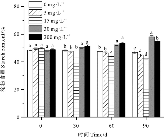 30和300 mg·L-1处理组鳗草种子的淀粉含量随时间延长呈上升趋势,而0、3和15 mg·L-1处理组鳗草种子的淀粉含量随时间延长呈下降趋势(见图 9)。单因素方差分析表明,至实验结束,30 mg·L-1处理组淀粉含量最高,显著高于其它处理组(P<0.05),为对照组的1.2倍,15 mg·L-1处理组的淀粉含量最低,显著低于其它处理(P<0.05),为对照组的90%。
