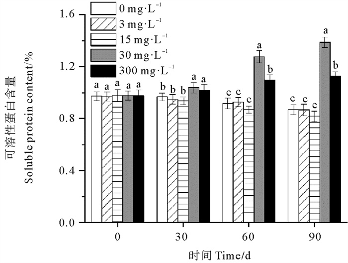 0、3和15 mg·L-1处理组鳗草种子的可溶性糖含量随时间延长呈上升趋势,而30和300 mg·L-1处理组鳗草种子的可溶性糖含量随时间延长呈现下降趋势(见图 8)。单因素方差分析表明,至实验结束时,30 mg·L-1处理组可溶性糖含量最低,显著低于其它处理组(P<0.05),为对照组的78%,15 mg·L-1处理组的可溶性糖含量最高,显著高于其它处理组(P<0.05),为对照组的1.1倍。