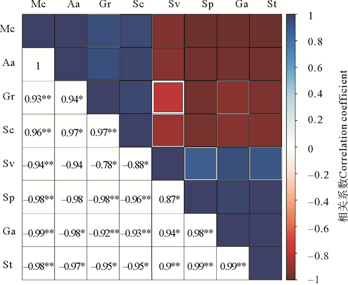 ( Mc代表水分含量(%),Aa代表α-淀粉酶活性活性(%),Gr代表萌发率(%),Sc代表可溶性糖含量(%),Sv代表种子活力(%),Sp代表可溶性蛋白(%),Ga代表再萌发率(%),St代表淀粉含量(%)。代表差异显著,代表差异极显著。Mc represents moisture content(%); Aa represents α-amylase activity(%); Gr represents germination rate(%); Sc represents soluble sugar content(%); Sv represents seed vigor(%); Sp represents soluble protein(%); Ga represents regermination rate(%); St represents starch content(%). represents significant difference, and represents very significant difference. ) 图 12 鳗草种子萌发的生态学指标与生理学指标的相关性分析 Fig. 12 Correlation analysis of ecological and physiological indexes of seed germination in eelgrass |