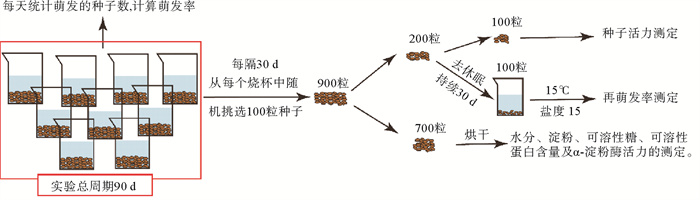 1.4 样品采集与测定各处理组的取样流程如图 2所示。实验总周期为90 d,实验期间每天对萌发的种子进行统计,计算萌发率。每隔30 d进行1次取样,取样时从每个烧杯中随机挑选100粒种子,每个处理组共计挑选900粒种子,从中随机挑选200粒,平均分成2份,分别用于种子活力及再萌发率的测定。种子活力的测定采用四唑法[16]。种子再萌发率测定时,将种子置于15 ℃、盐度15的海水中进行30 d的去休眠,每天统计萌发的种子数,计算萌发率。萌发率及种子活力的计算方法如下: